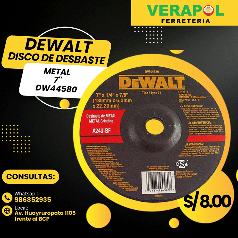 ¿Buscas un disco de desbaste para metal que combine durabilidad, potencia y seguridad? El Disco de Desbaste 7 pulgadas DW44580 DeWalt es la solución perfecta para profesionales que necesitan cortes y desbastes eficientes en todo tipo de superficies metálicas.